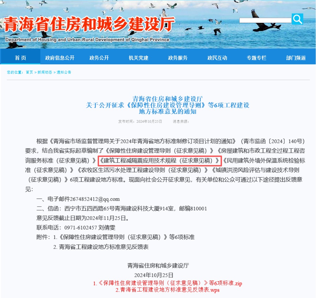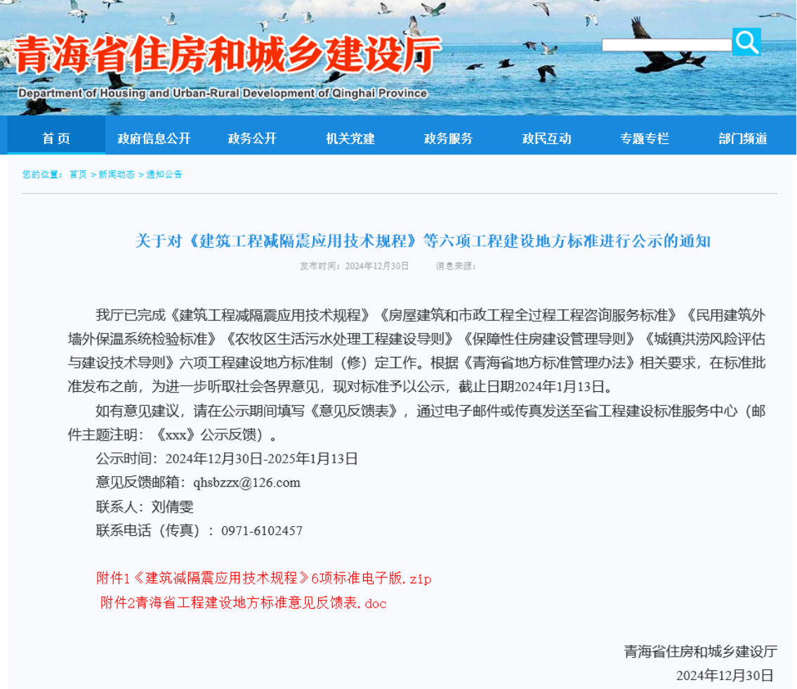 2024年12月30日,青海省住房和城乡建设厅发布《建筑工程减隔震应用技术规程》工程地方标准公示的通知。