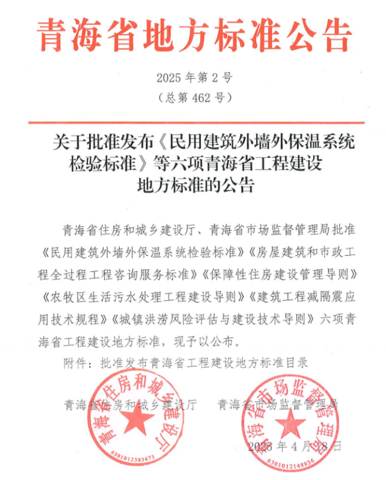 2025年4月18日,青海省地方标准公告 2025年第2号文件下发,批准发布《建筑工程减隔震应用技术规程》,确定标准实施日期为2025年5月18日。